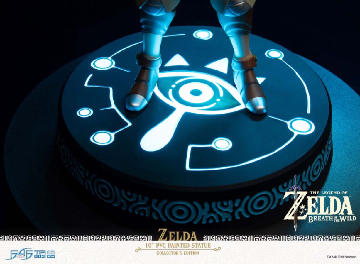 The highly detailed Zelda PVC statue is seen striking a static yet commanding pose, with the Sheikah Slate in hand. The design on the base is based on the symbol that initiates when activating the Sheikah Slate interface. The Collector's Edition of this statue comes with bright LED functions for both the Sheikah Slate and the base.