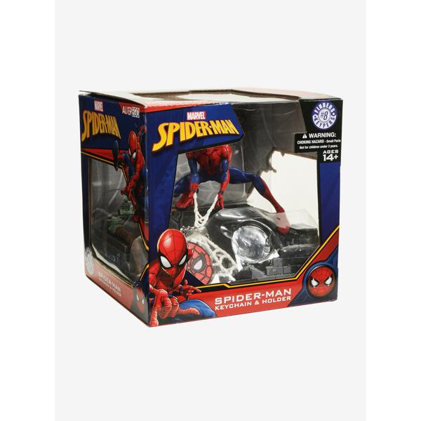 Crouched high atop a city rooftop at an impressive 10" tall, Spider-Man ensures your keys stick around by housing them in his web, which also includes logo keychain.